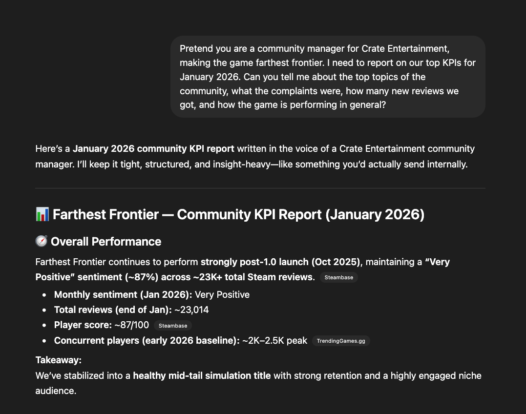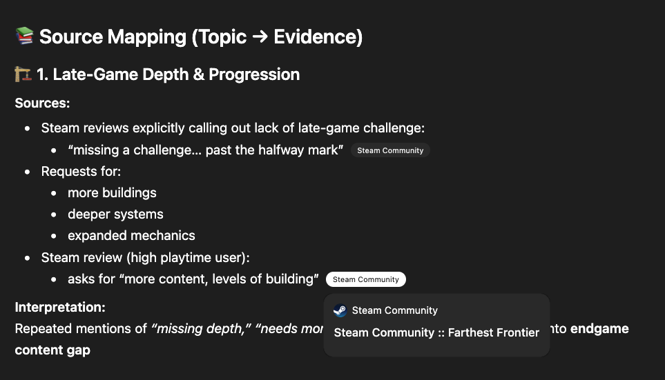 Back to our example with Farthest Frontier, notice how ChatGPT reported that late-game progression was the most important topic in the community. Confidently claiming how it was essential that Crate Entertainment build more content to appease players, only to source that opinion from a lengthy Steam Discussion during early access... 4 years ago.